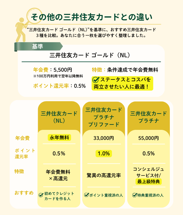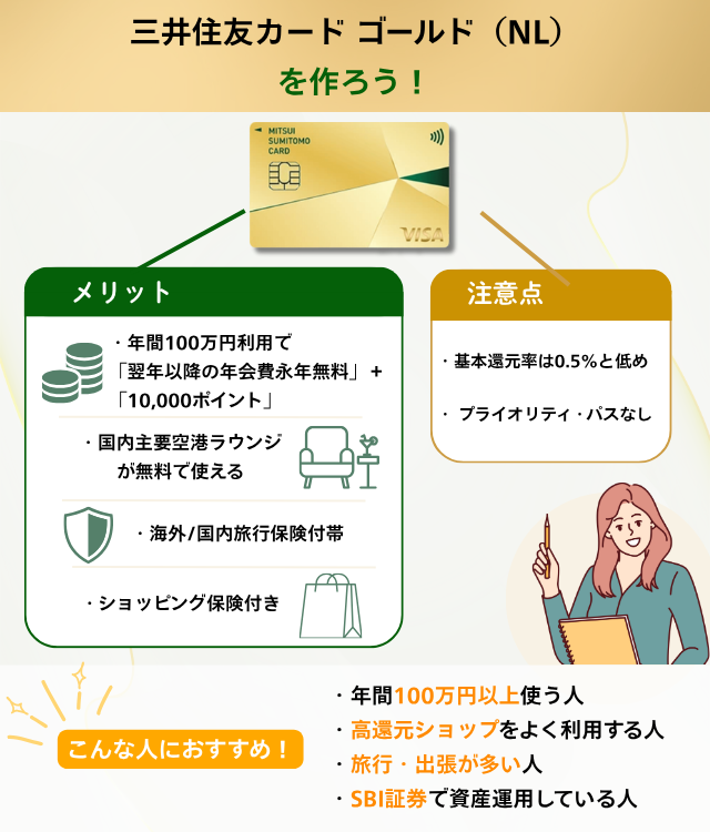 年間100万円以上使う人・ポイント還元が高いお店をよく使う人・旅行や出張の機会が多い人・SBI証券で資産運用をしている人は、三井住友カード ゴールド(NL)が向いている可能性が高い。