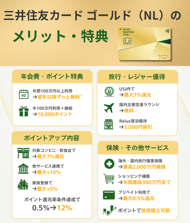 まずは、三井住友カード ゴールド(NL)の豊富なメリット・特典について解説する。