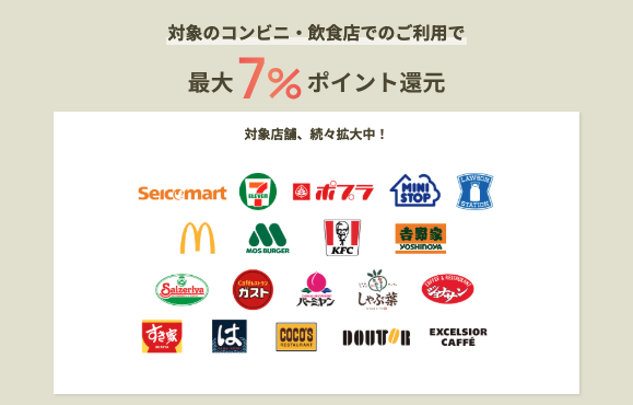 - 出典:三井住友カード株式会社「対象のコンビニ、飲食店で最大7%還元!」