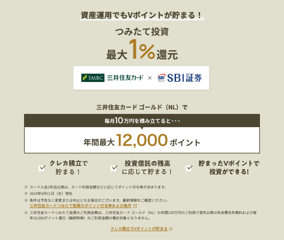 SBI証券で資産運用している方や、これから資産運用を始めようと考えている方にとっても、三井住友カード ゴールド(NL)はおすすめだ。