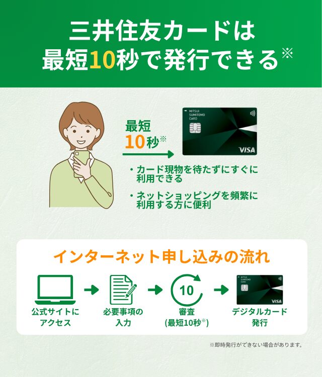一部の三井住友カードでは、オンラインで申し込み最短10秒でデジタルカードが発行される。※即時発行ができない場合があります。