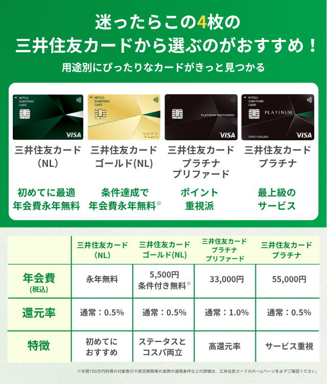| カード名 | 三井住友カード(NL) | 三井住友カード ゴールド(NL) | 三井住友カード プラチナプリファード | 三井住友カード プラチナ |