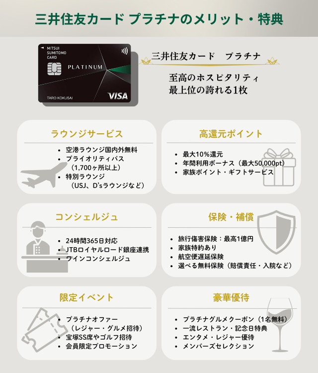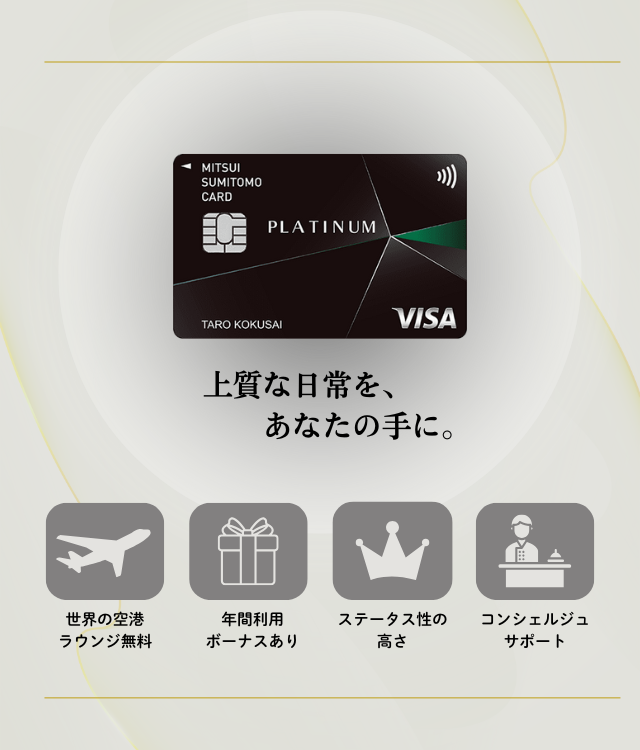 三井住友カード プラチナには『至高のホスピタリティ 最上位の誇れる1枚』というキャッチコピーが付けられ、他カードでは得られない上質な特典や優待が用意されている。