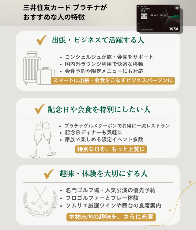 ここからは、三井住友カード プラチナの魅力をより深くイメージするために、具体的な活用シーンを紹介する。