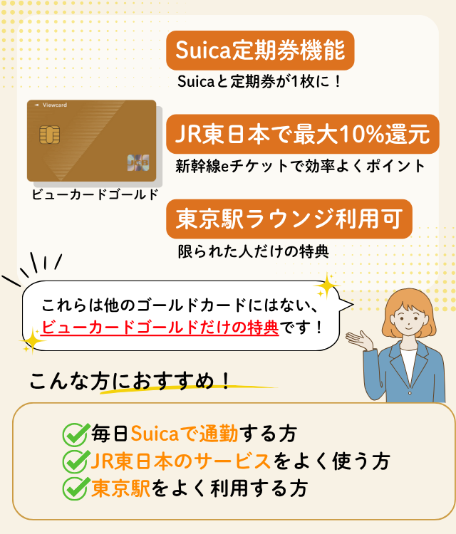 他社のカードも含めたおすすめのゴールドカードの中でも、特にSuicaやJR東日本のサービスを頻繁に利用する方に大きなメリットがあるカードだ。