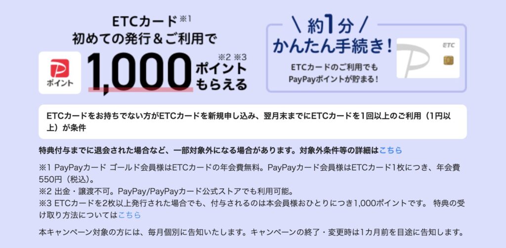 意外と見落としがちなのが、ETCカードの追加発行特典です。PayPayカードのETCカードの年会費は通常550円(税込)ですが、現在実施されているキャンペーンでは、条件を満たした新規発行で初年度年会費が無料になり、さらに1,000ポイント前後のPayPayポイントがもらえます。