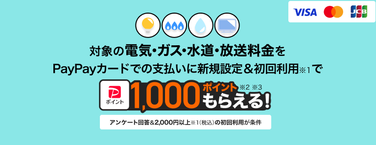 電気・ガス・水道などの公共料金支払いをPayPayカードに切り替えることで、まとまったポイントを獲得することができます。対象の公共料金をPayPayカード/PayPayカード ゴールドに新規設定し、1回あたり2,000円以上(税込)利用すると1,000ポイントがもらえます。なお、PayPayクレジット払いは対象外となるので注意しましょう。