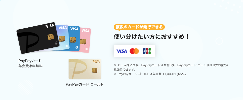 PayPayをお得に使うためのクレジットカードには、年会費無料の「PayPayカード」と、上位ランクの「PayPayカード ゴールド」の2種類があります。