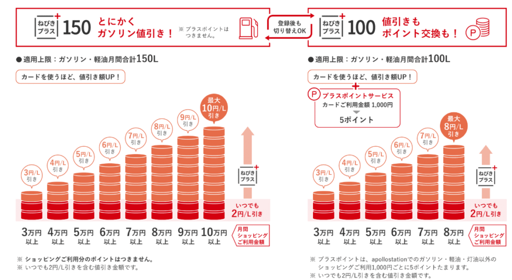 さらに「ねびきプラスサービス」のオプションに登録すれば、カード利用額に応じてガソリン・軽油の値引き単価が最大10円/Lまでアップする。