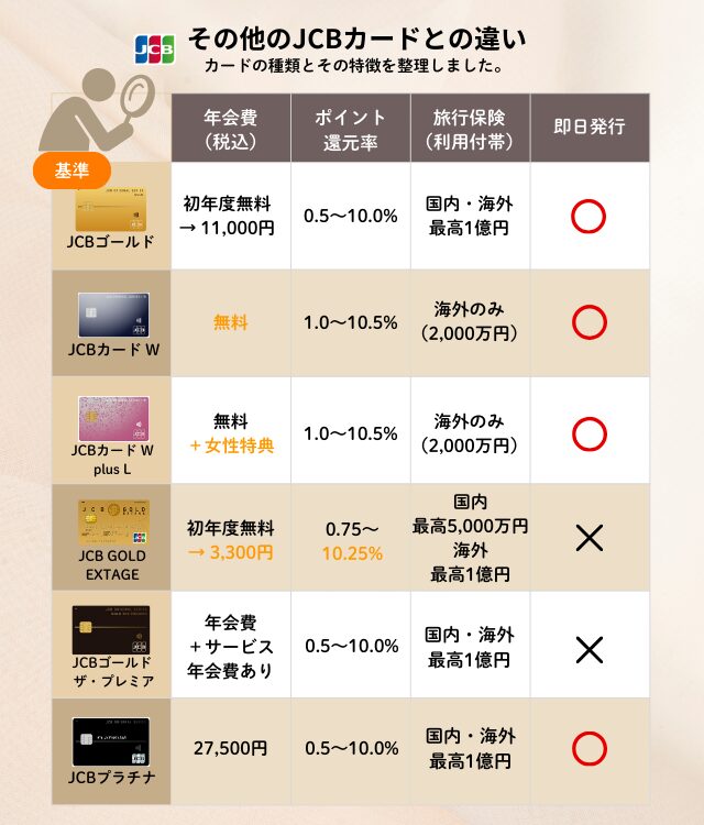 JCBゴールド以外の主要券面とその特徴を比較しよう。