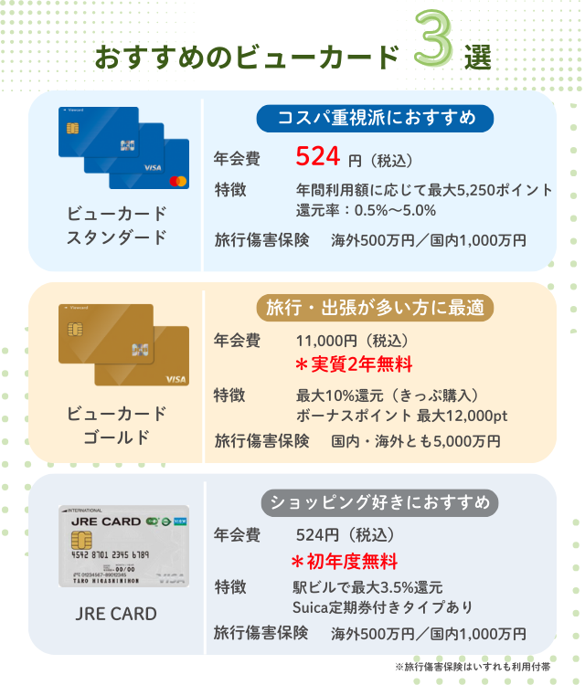 「種類が多くて決められない」という方に、ここでは特におすすめのビューカードを3つ厳選して紹介する。