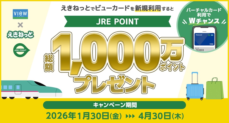 エントリーのうえ、キャンペーン期間中に「えきねっと」で対象の新幹線や特急列車をビューカード決済すると、通常のJRE POINTに加えて抽選で最大10,000ポイントが当たる。