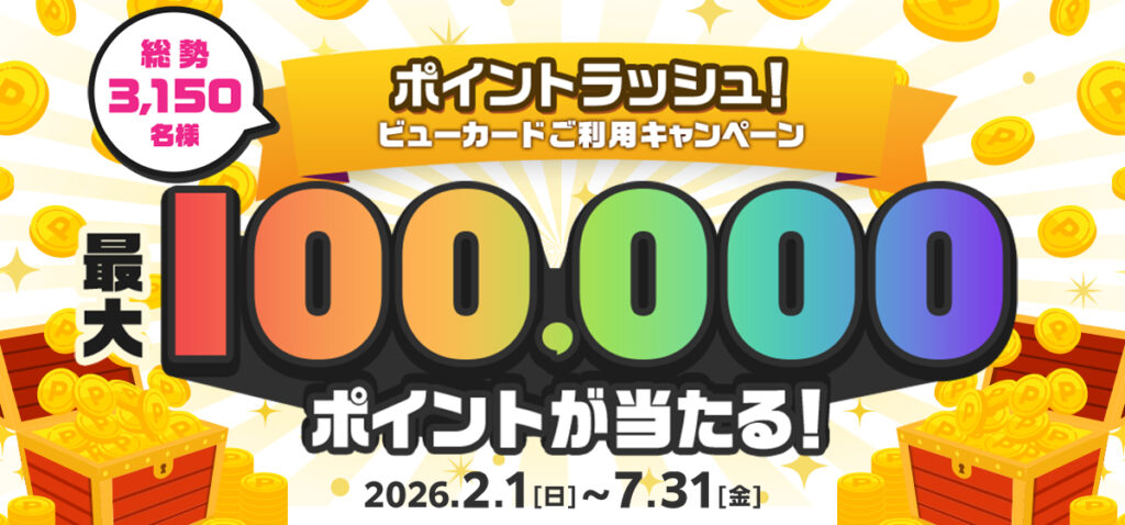 ビューカードを利用して3万円以上買い物すると、抽選で100,000ポイントが当たる。