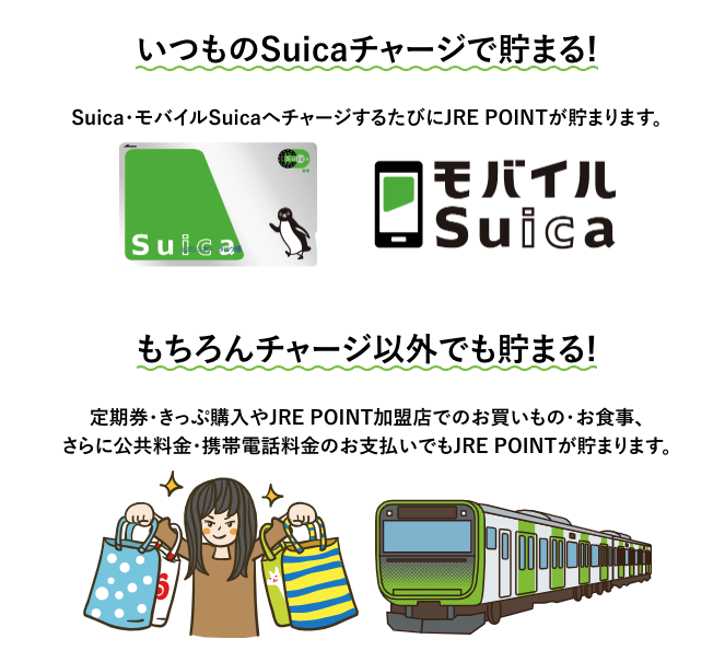 ビューカードでは、Suicaへのチャージをはじめ、さまざまな利用方法があるJRE POINTが貯められる。