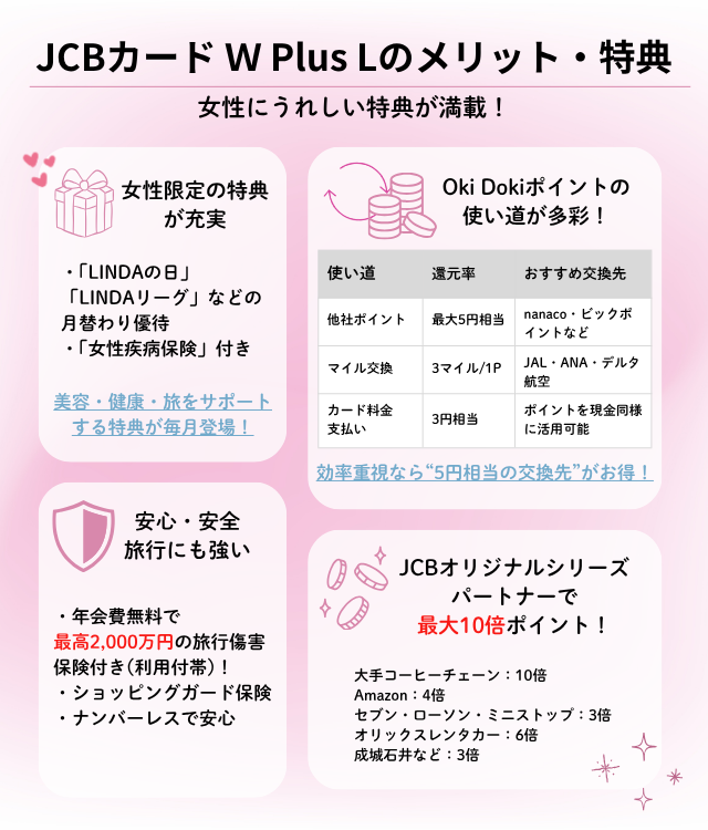 JCBカード W Plus Lには、JCBカード Wの特典と合わせて女性限定の特典が用意されている。