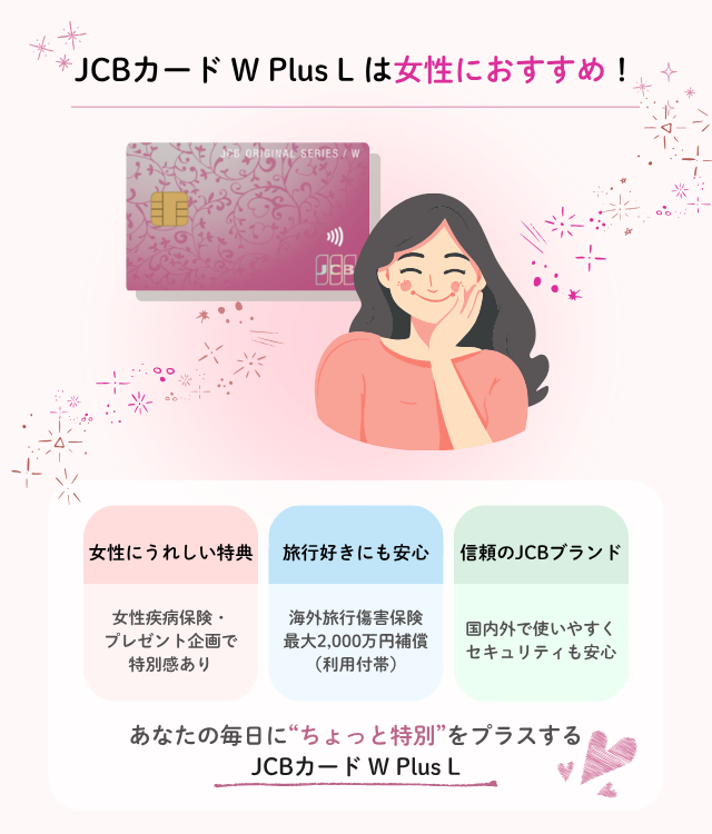 JCBカード W Plus Lには、JCBカード Wの特典と合わせて女性限定の特典が用意されている。
