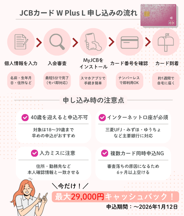 JCBカード W Plus Lは、18歳〜39歳限定で作成できるクレジットカードで、魅力的な特典が多い。