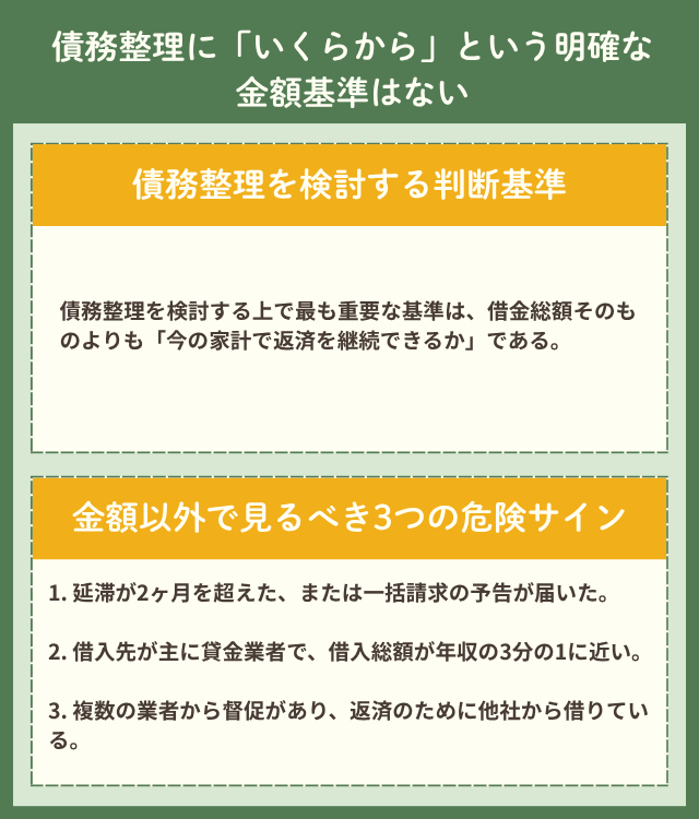 - 債務整理に一律の「いくらから」という基準はない。判断軸は「家計余剰」。