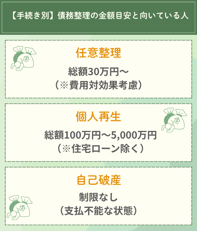 | 適する金額目安 | 総額30万円〜(※費用対効果考慮) | 総額100万円〜5,000万円(※住宅ローン除く) | 制限なし(支払不能な状態) |