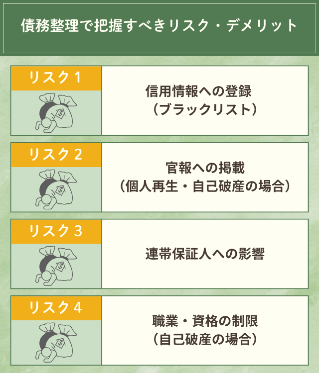 債務整理は借金問題を解決する有効な手段だが、実行する上で知っておくべきリスクやデメリットもある。これらを理解した上で、手続きを選択することが大切である。
