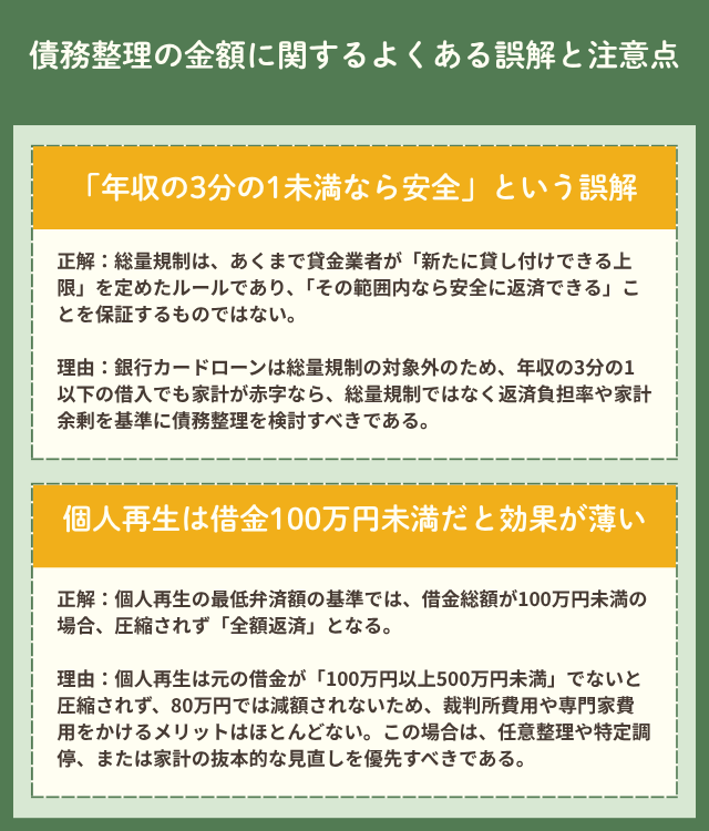 H3-1で解説した通り、銀行カードローンは総量規制の対象外である。例えば、貸金業者からの借入が年収の3分の1以下でも、銀行カードローンを含めた総額では年収の半分を超えているケースも珍しくない。判断すべきはあくまで総量規制の数字ではなく、H3-2で解説した「返済負担率(家計に占める返済の割合)」や「家計余剰」である。年収の3分の1以下でも、家計が赤字であれば、債務整理の検討が必要である。