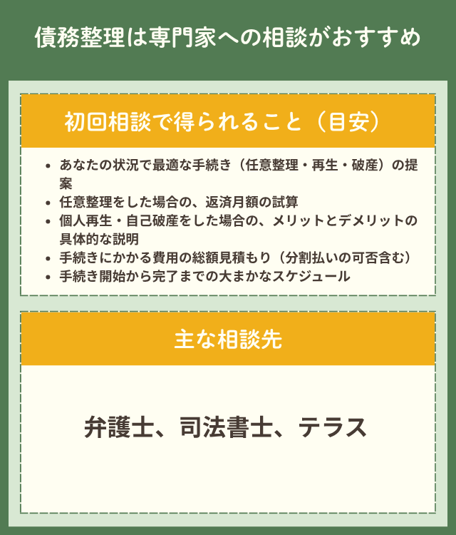 債務整理は、法的な知識と交渉経験が必要な手続きである。一人で悩んでいても、借金の利息は日々増え続けてしまう。まずは専門家の初回無料相談などを利用し、「あなたの場合はどうなるか」を診断してもらうことが解決への第一歩である。