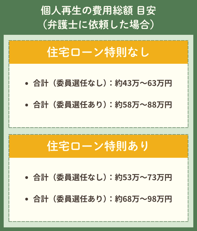 費用の総額は、住宅ローン特則(住宅を残す仕組み)を利用するかどうか、また、手続きを監督する「個人再生委員」が選任されるかどうかで変動します。