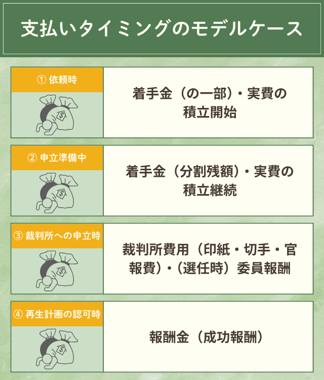 | ④ 再生計画の認可時 | ・報酬金(成功報酬) | ※手続きが成功した場合に発生 |