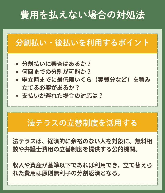 「返済を止めても、弁護士費用や裁判所費用を積み立てる余裕がない」という場合でも、いくつか対処法があります。