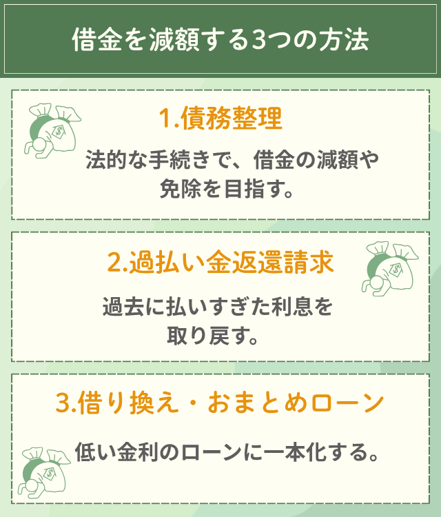 この記事では、借金減額の主な3つの方法「債務整理」「過払い金請求」「借り換え・おまとめローン」の仕組みと、それぞれのメリット・デメリットを解説した。