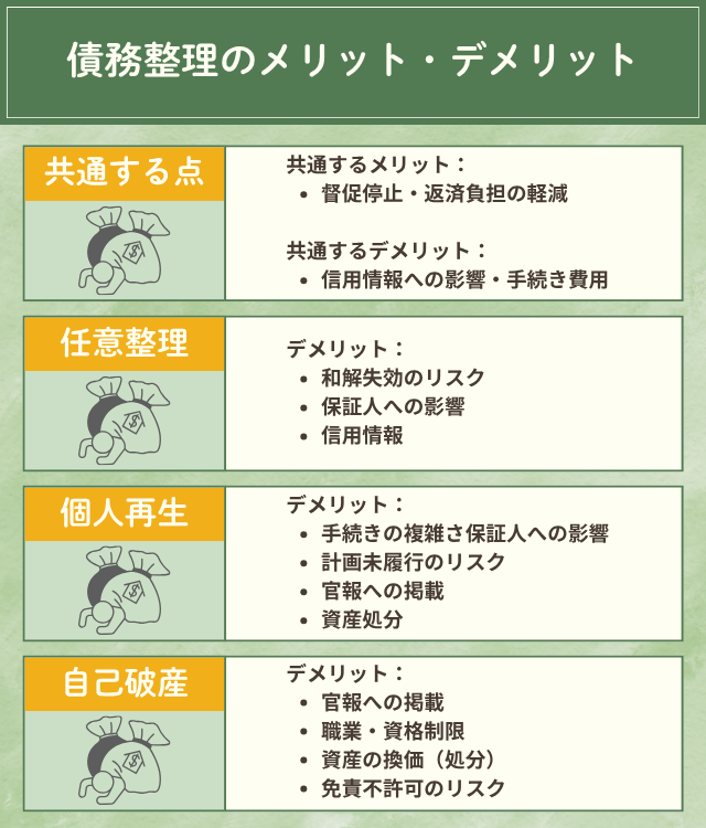 | 自己破産 | 返済義務が免除 | 原則換価(処分) | 登録あり(概ね5年、KSC最長7年) | 数か月〜1年程度 | 原則処分 |