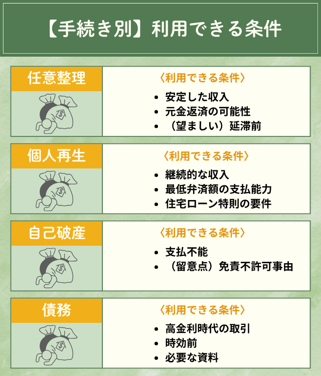 | 必要条件(例) | 安定収入・返済意思 | 継続的収入・総額5,000万円以下 | 支払不能であること | 上限金利超過の取引 | 審査通過・返済能力 |