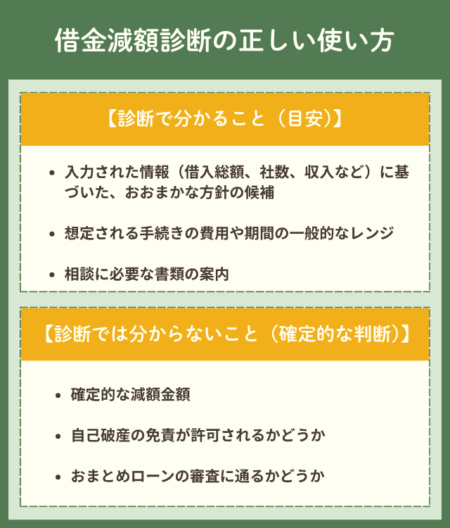 診断ツールは、あくまで「自身の状況に近い債務整理の方法を知るための入口」にすぎない。分かることと分からないことを理解し、安全に利用するためのポイントを押さえるべきだ。