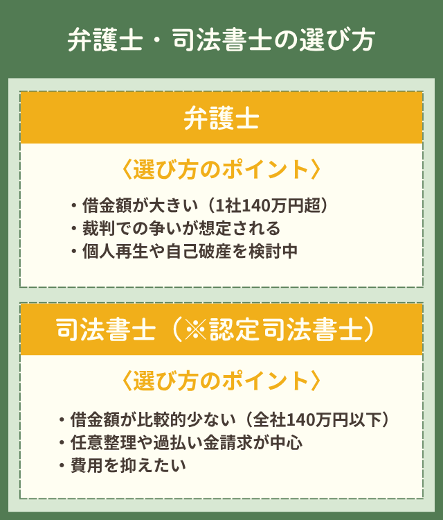 | 選び方のポイント | ・借金額が大きい(1社140万円超)・裁判での争いが想定される・個人再生や自己破産を検討中 | ・借金額が比較的少ない(全社140万円以下)・任意整理や過払い金請求が中心・費用を抑えたい |