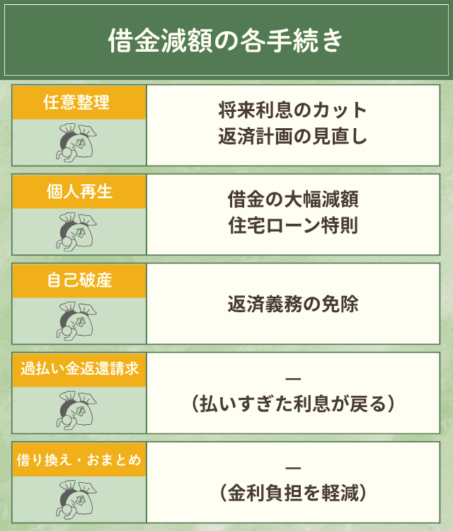 | 何が減るか | 将来利息・遅延損害金 | 元金・利息・損害金 | 返済義務が免除 | —(払いすぎた利息が戻る) | —(金利負担を軽減) |