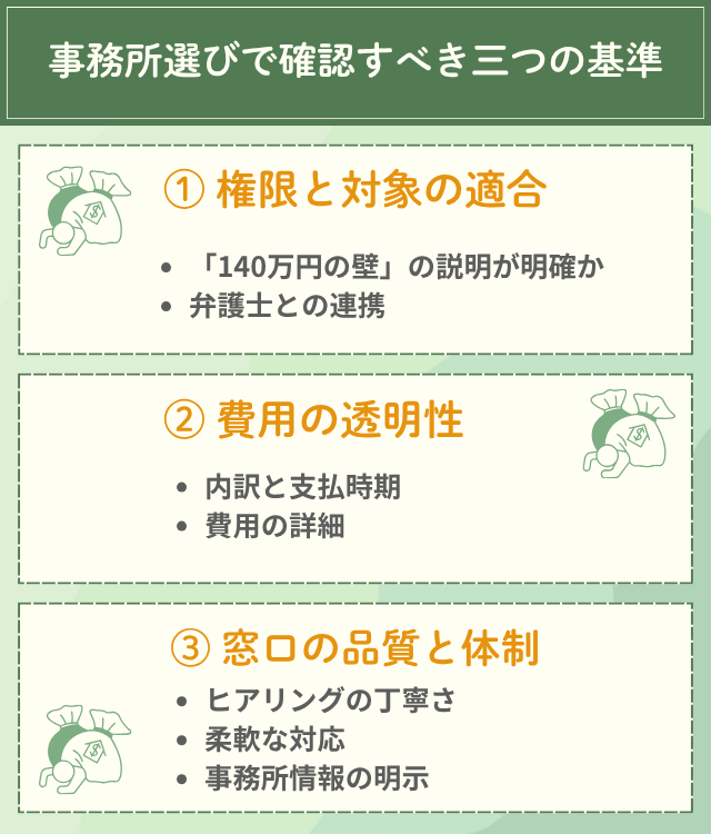 こうした点は事務所ごとに対応が異なるため、相談時に必ず書面で確認する必要がある。