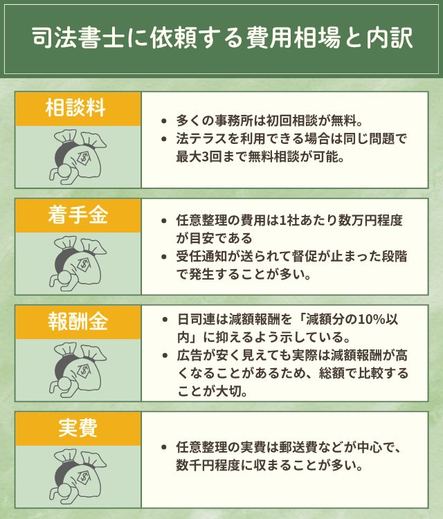 任意整理の場合、1社あたり数万円程度が目安である。受任通知が発送され、督促が止まった時点で発生することが多い費用である。