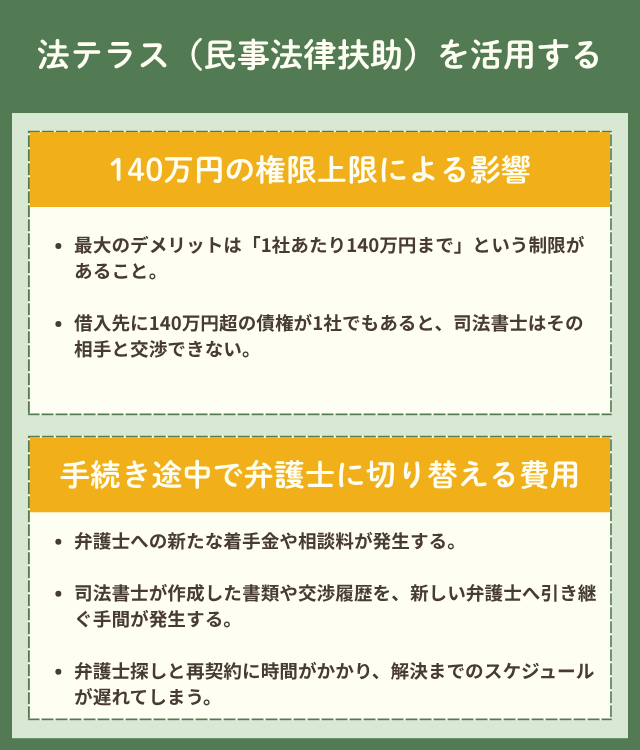 この切り替えが発生すると、新たに弁護士を探す手間や追加の費用(着手金など)がかかる可能性がある。また、司法書士からの引き継ぎ資料(受任通知、取引履歴、和解案の写しなど)を準備する必要も出てくる。