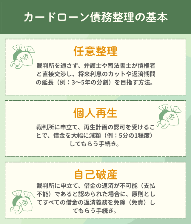 カードローンの返済が困難になった場合、法的手続きや交渉を通じて負担を軽減する方法を「債務整理」という。本章では、債務整理の全体像とカードローン特有の基本ポイントを整理する。
