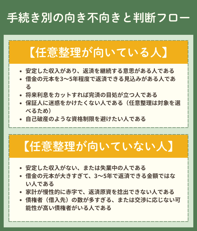 - あなたに最適な債務整理の手続き(任意整理、個人再生、自己破産)の提案
