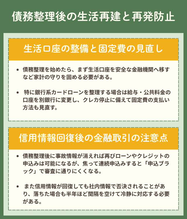 - 再発防止:手続き後は家計を見直し、固定費の支払い方法を(口座振替やデビットカードへ)切り替えることが、生活再建の鍵となる。