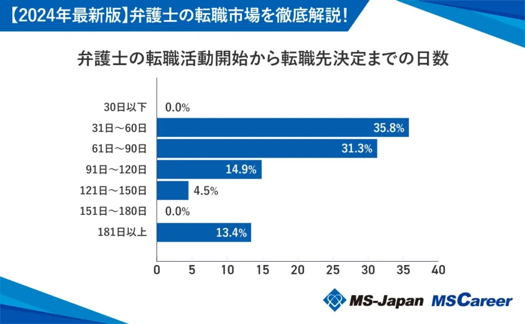 転職エージェントである株式会社MS-Japanの調査によれば、転職先が決定するまでに91日以上かかった人は全体の32.8%を占め、181日以上もかかった人は13.4%にも及ぶ。