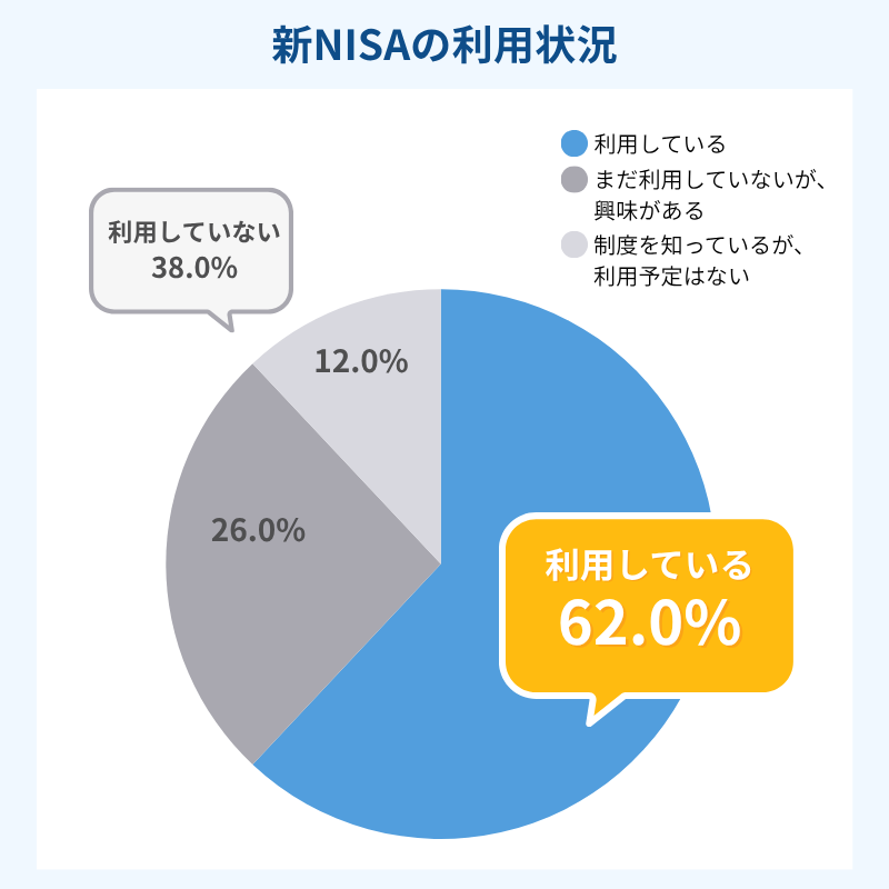 当サイトが実施した「NISAの利用状況に関する調査」では、新NISAを「利用している」との回答が62.0%に達しており、NISAが浸透していることがわかる。