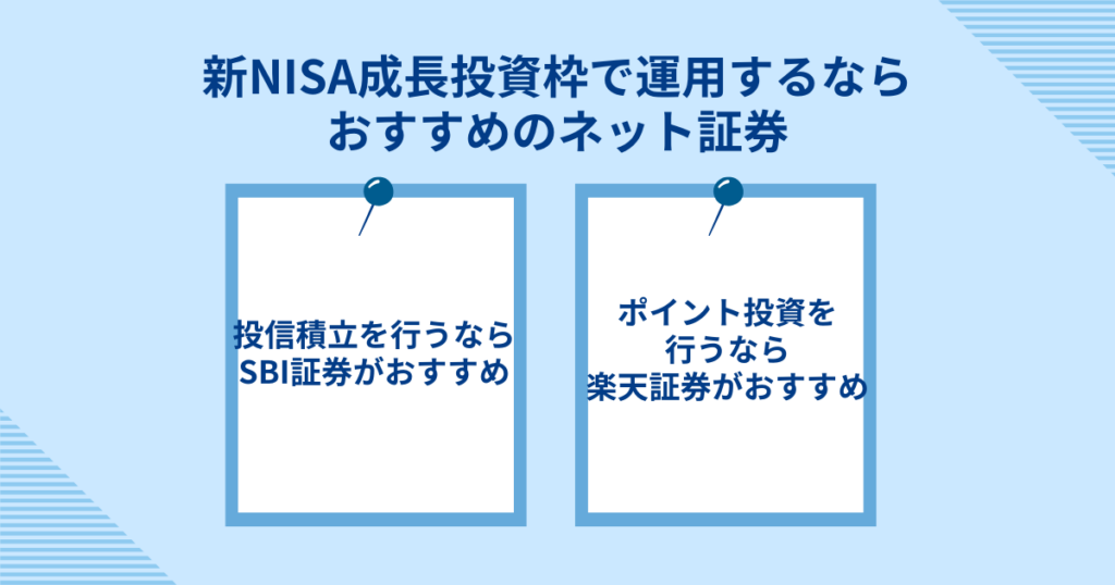 新NISA成長投資枠で投資を始めるなら、SBI証券または楽天証券を利用するのがおすすめだ。