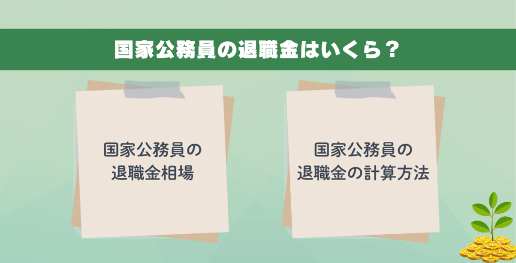 国家公務員の退職手当(退職金)は「国家公務員退職手当法」に定められており、「基本額(退職日の俸給月額×退職理由別・勤続期間別支給率)+調整額」で計算されている。