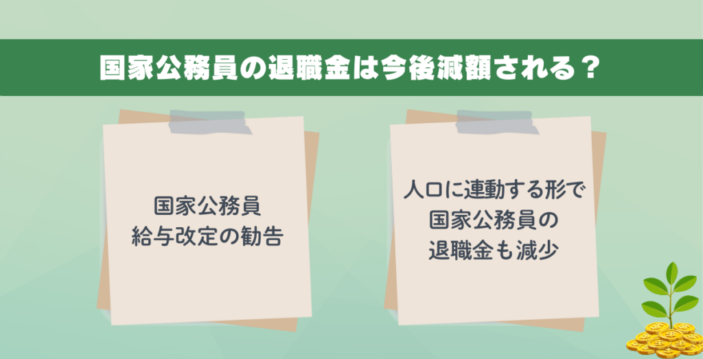 さらに、今後人口が減少し、経済成長が鈍化すると民間の給与水準も影響を受け、国家公務員の給与等や退職手当(退職金)の見直しが行われる可能性もある。