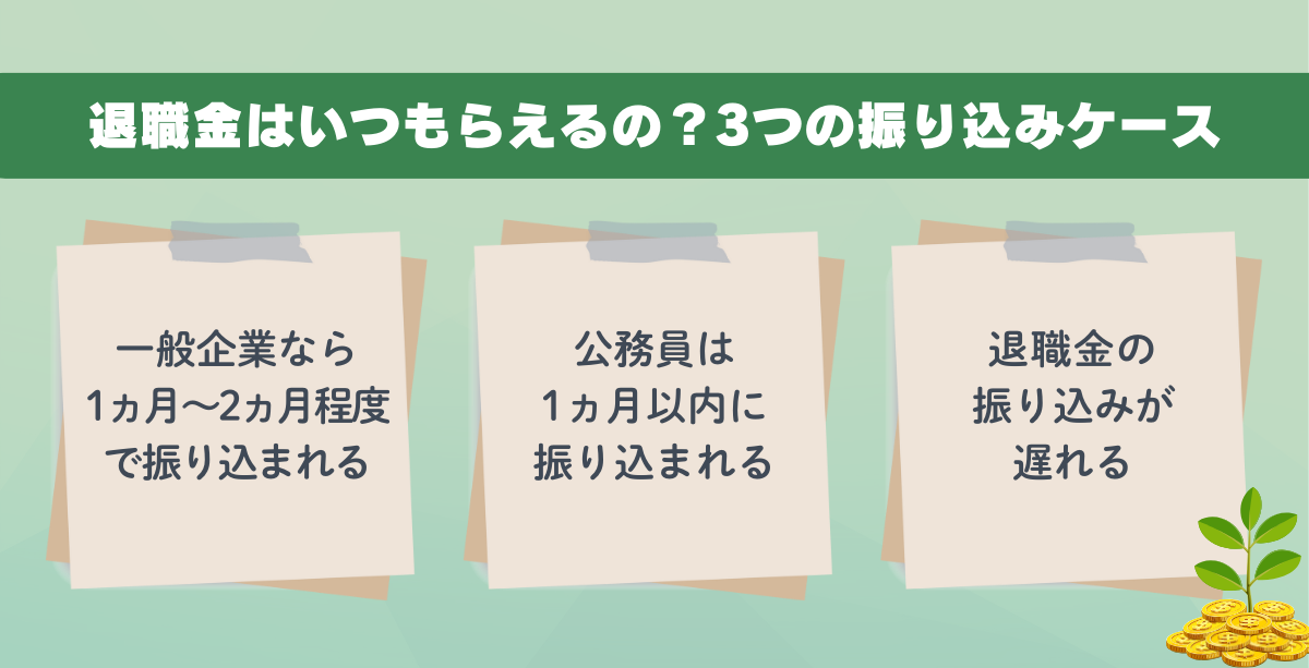 まずは、退職金はいつもらえるのか、基本的な3つの振り込みケースについて説明していく。