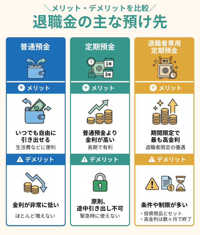 すでに普通預金の口座を持っているケースが多いため、退職金の預け先として選択肢に入ってくるだろう。