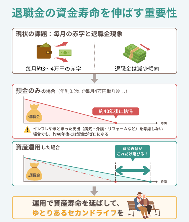 退職金はただ預けるだけだと老後の生活で不足する可能性が高いため、運用に回して資産寿命を延ばしていく工夫が必要となる。