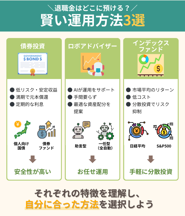 本記事でご紹介した債券投資やロボアドバイザー、インデックスファンドなどを活用し、退職金の運用を実践していこう。